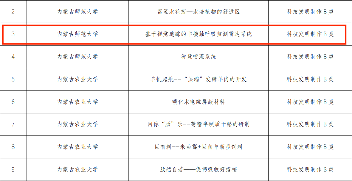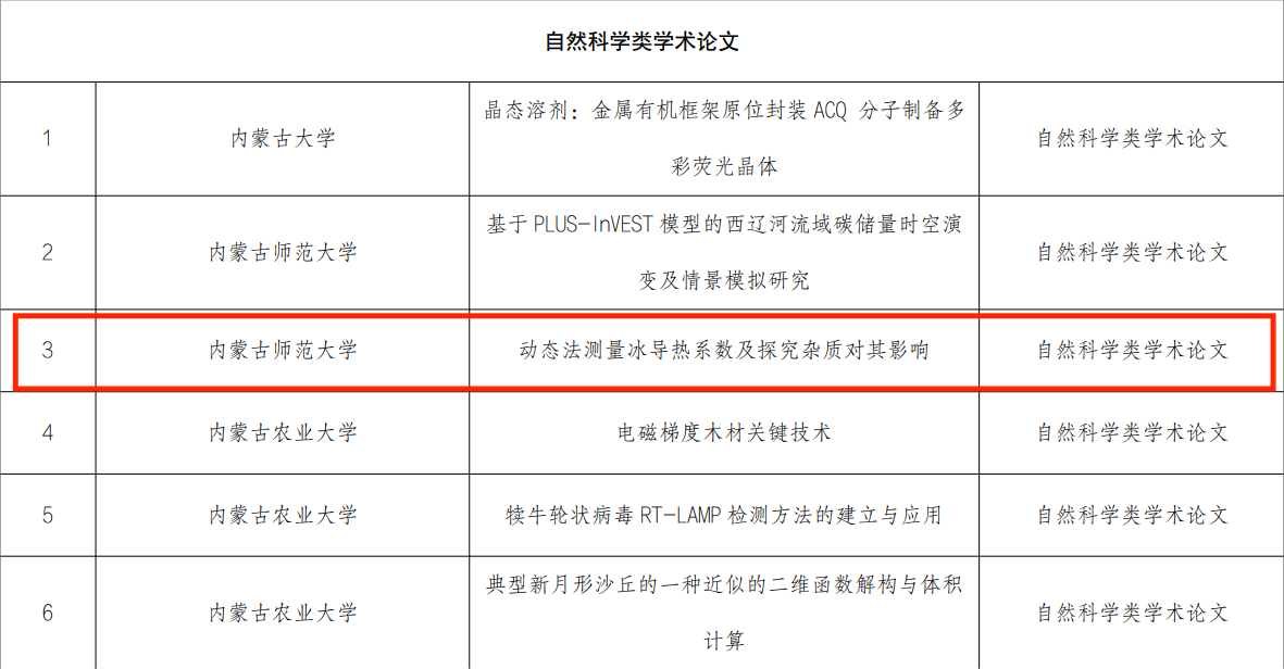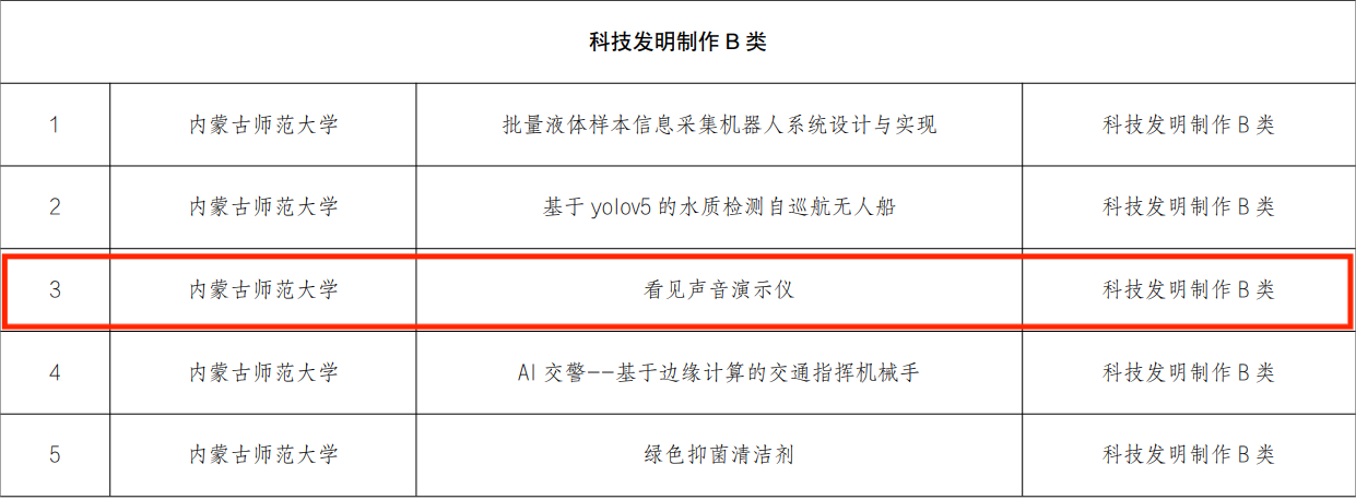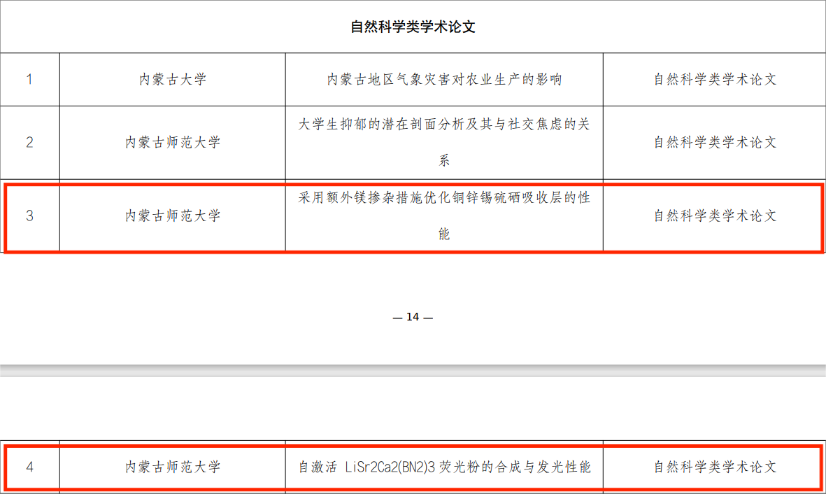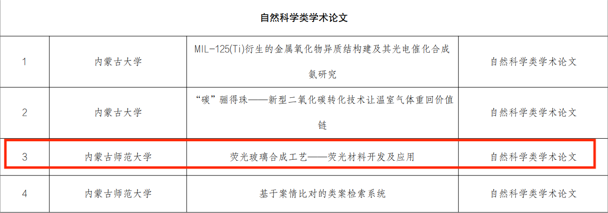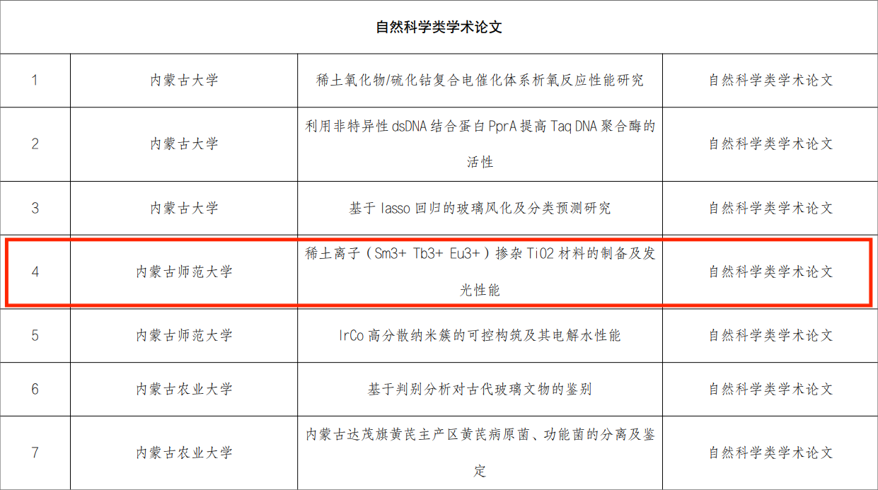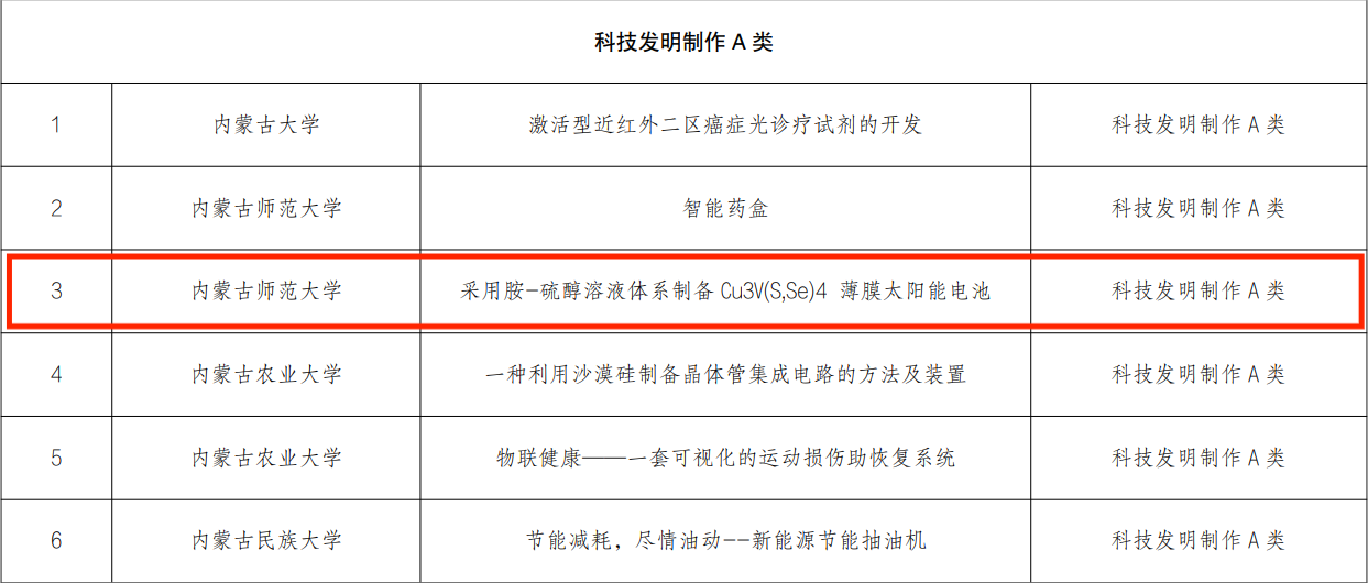 近日,内蒙古自治区第十三届“挑战杯” 全区大学生课外学术科技作品竞赛获奖名单公布,在我院师生的共同努力下,斩获特等奖1项,一等奖3项,二等奖3项,三等奖3项。特等奖是:那仁格日乐老师指导、刘文慧同学负责的自然科学类学术论文:《稀土离子(Sm3+、Tb3+、Eu3+)掺杂TiO2材料的制备及发光性能》;一等奖分别是:张伟老师指导、刘臻奇同学负责的哲学社会科学类调查报告:《内蒙古自治区公费定向师范生学习状况调查研究报告--以永利官网为例》;杨帆老师指导、李波兴同学负责的科技发明制作:《基于视觉追踪的非接触呼吸检测雷达》;朝克夫老师指导、李月朋同学负责的自然科学类学术论文:《动态测量冰导热系数》;二等奖:由杨艳春老师指导、曹铭旸同学负责的自然科学类学术论文:《采用额外镁掺杂措施优化铜锌锡硫硒吸收层的性能》;由朝克夫老师指导、廖雨负责的:《自激活 LiSr2Ca2(BN2)3 荧光粉的合成与发光性能》;由杨帆老师指导、吴倩倩负责的:《虚拟仿真助力偏远地区物理实验教学一完全弹性碰撞,相遇追击,天体物理 》;三等奖:由杨艳春老师指导、任俊婷同学负责的科学发明制作:《采用胺-硫醇溶液体系制备Cu3 (S.Se)4薄膜太阳能电池》;由朝克夫老师指导、廖雨同学负责的科学发明制作:《看见声音演示仪》;由朝克夫老师指导、邹子安同学负责的自然科学学术论文:《荧光玻璃合成工艺-荧光材料开发及应用》。