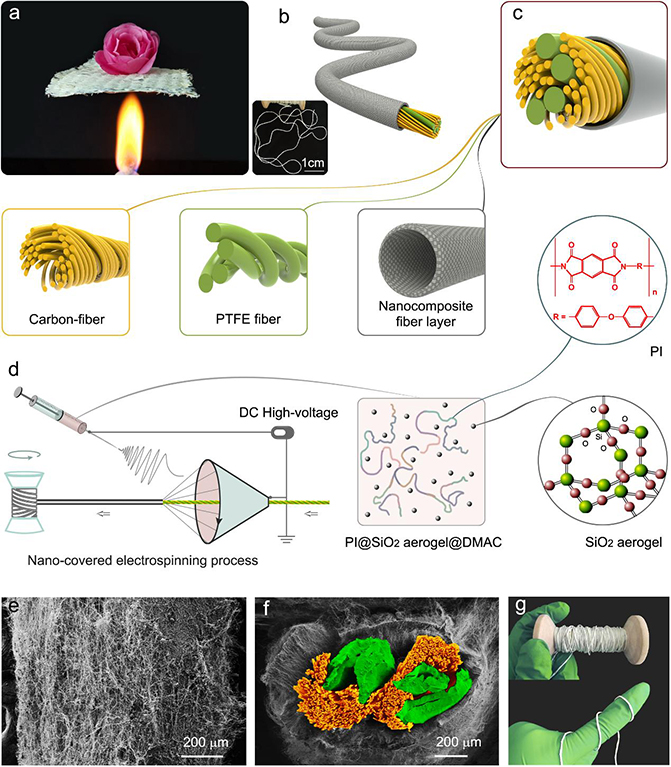 (a) 全纱线摩擦纳米发电机(Y-TENG)的耐高温、阻燃功能展示;(b)-(c) Y-TENG的结构及组成;(d) Y-TENG的制备工艺;(e)-(f) Y-TENG表面和截面的扫描电镜图像;(g) Y-TENG的实物照片。