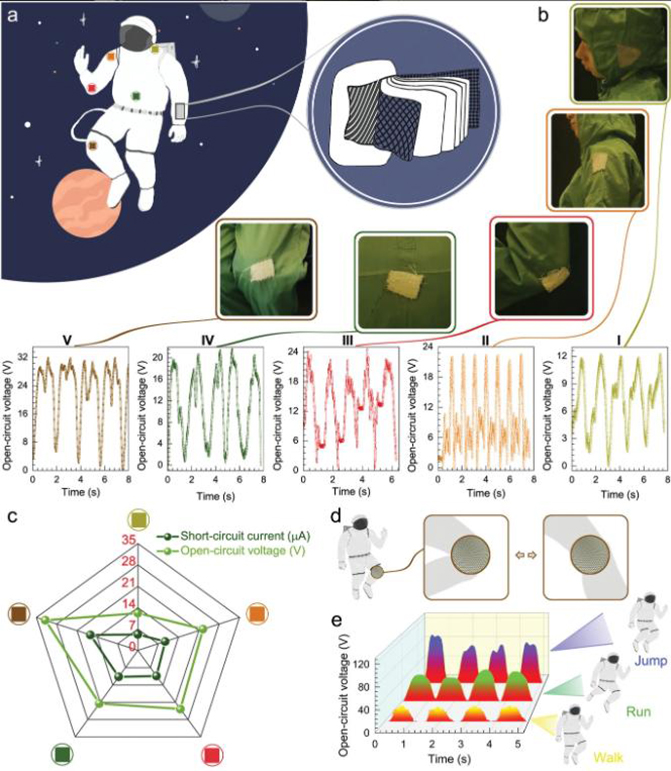 (a) 智能防护服适用场景展示;(b) Y-TENG植入到防护服不同位置的照片及其运动特征对应的输出电信号;(c) 不同位置Y-TENG输出信号的数据统计及对比结果;(d)-(e) 膝盖处Y-TENG在不同运动状态下的输出性能展示。