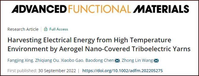 近日,yl6776永利集团自治区功能材料物理与化学重点实验室与中国科学院北京纳米能源与系统研究所王中林院士课题组合作,以共同一作在国际学术期刊《ADVANCED FUNCTIONAL MATERIALS》上发表学术论文。共同第一作者分别为北京纳米能源与系统研究所邢方静博士、内师大yl6776永利集团欧志强副教授,共同通讯作者为北京纳米能源与系统研究所陈宝东副研究员和王中林院士。该研究成果提出了一种全纱线摩擦纳米发电机(Y-TENG),用于在25 ~ 400 ℃的温度范围内收集电能并感知生物运动,极大地提高了温度上限。其研究成果“Harvesting Electrical Energy from High Temperature Environment by Aerogel Nano-Covered Triboelectric Yarns”发表在国际学术期刊《ADVANCED FUNCTIONAL MATERIALS》(影响因子:19.92)上。