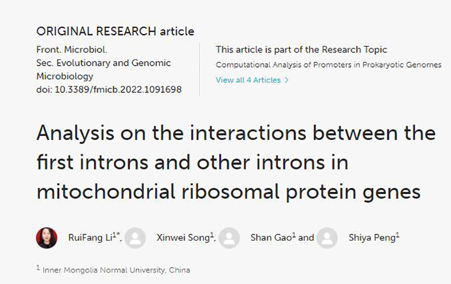 近日,yl6776永利集团理论物理团队李瑞芳副教授携硕士研究生在Frontiers in Microbiology (中科院二区top,JCR一区期刊,最新影响因子6.064)发表了题为“Analysis on the interactions between the first introns and other introns in Mitochondrial Ribosomal Protein Genes”的研究论文。