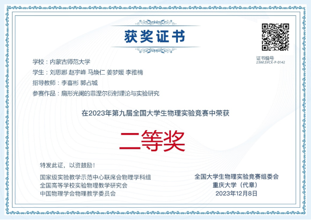 我院推荐作品“扇形光阑的菲涅尔衍射理论与实验研究”荣获命题类作品二等奖,团队由刘思娜、赵宇峰、马焕仁、姜梦媛、李雅楠组成,李喜彬、郭占城老师指导。