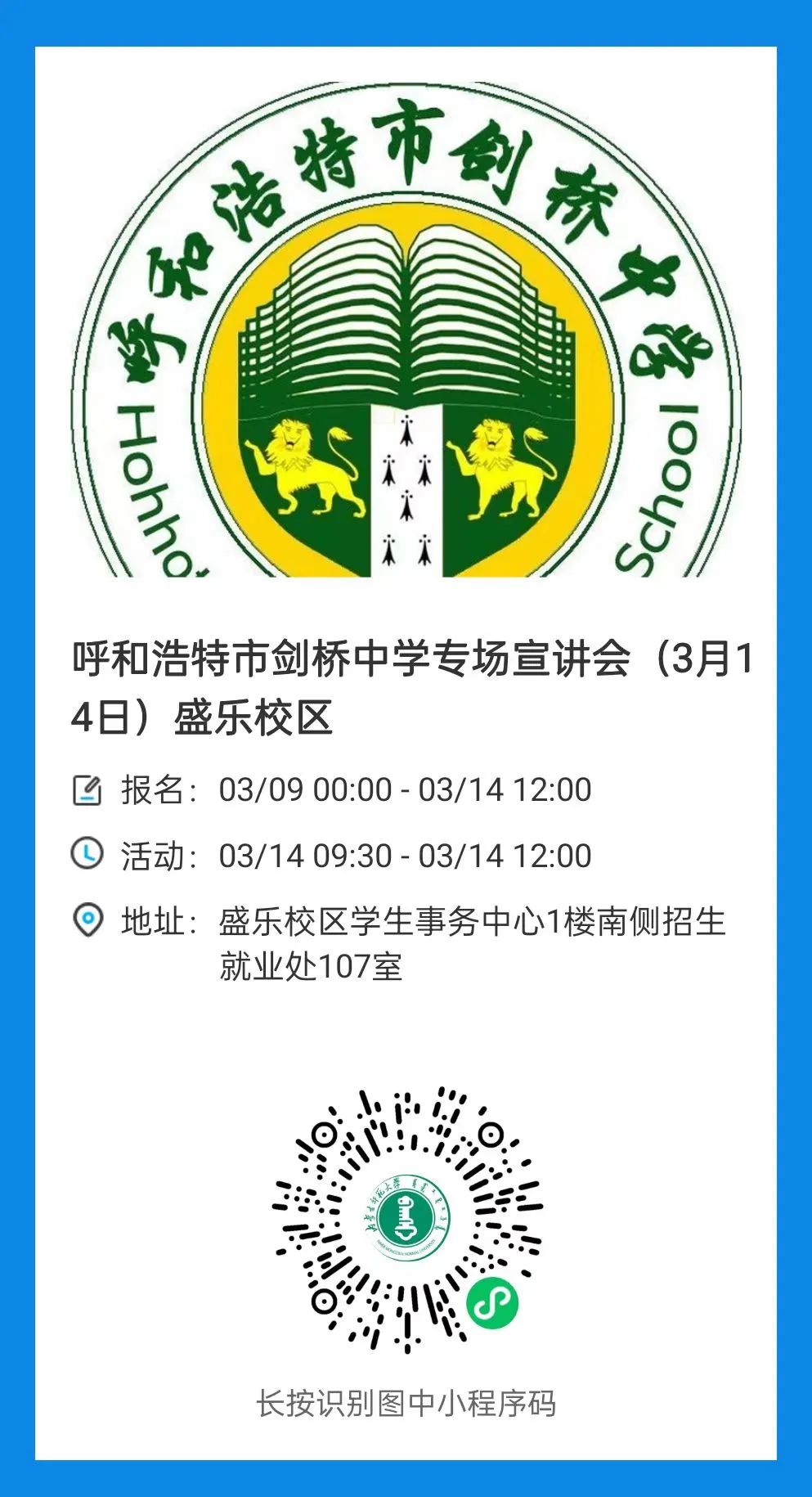 【就业信息】呼和浩特市剑桥中学专场招聘会(3月14日)盛乐校区