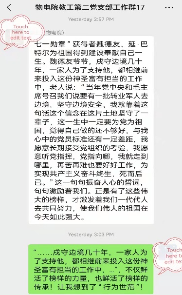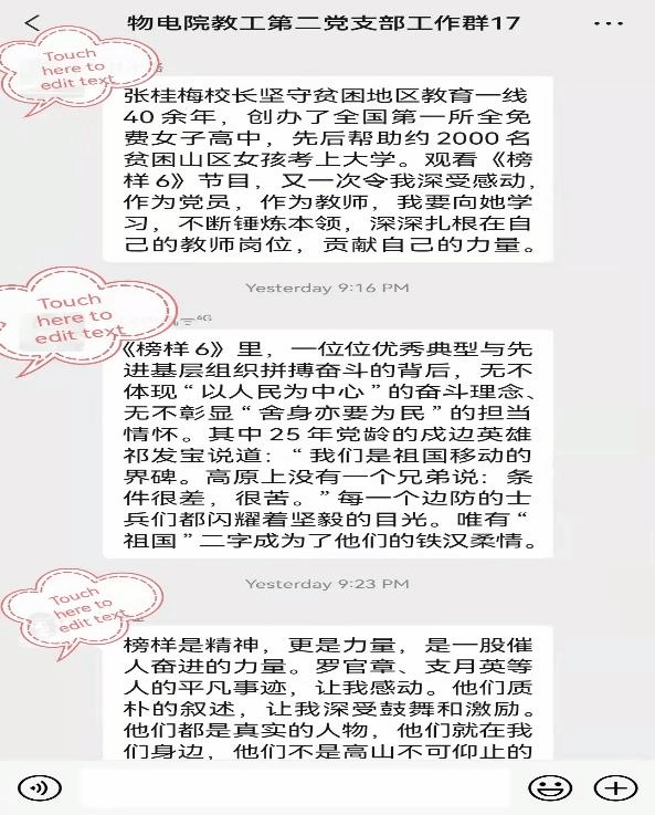 通过学习榜样先进事迹,汲取榜样力量,充分发挥先进典型示范引领作用,大力宣传“七一勋章”获得者和全国“两优一先”表彰对象的典型事迹,按照学校党委及学院党委的要求,2021年12月8日晚八点组织我院教工第二党支部组织观看了由中央组织部、中央广播电视总台联合录制的《榜样6》(建党100周年特别节目),节目通过讲述优秀共产党人榜样的动人事迹,展现了中国共产党人不忘初心、牢记使命的崇高精神,在各行各业的岗位上默默耕耘、充分发挥基层党组织战斗堡垒作用和党员先锋模范作用的典型事迹。