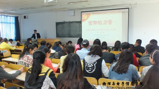 本网快讯 2015419日下午,我院于计算机楼六共第二次开展第十一期积极分子分党校党课培训,主讲人辛国俊老师,我院萨其尔老师主持本次活动。本次党课以信仰的力量为主题,各位同学通过学习获益匪浅,深度思考与总结“信仰”所带来的力量,在提升自我的同时坚定了入党的决心。