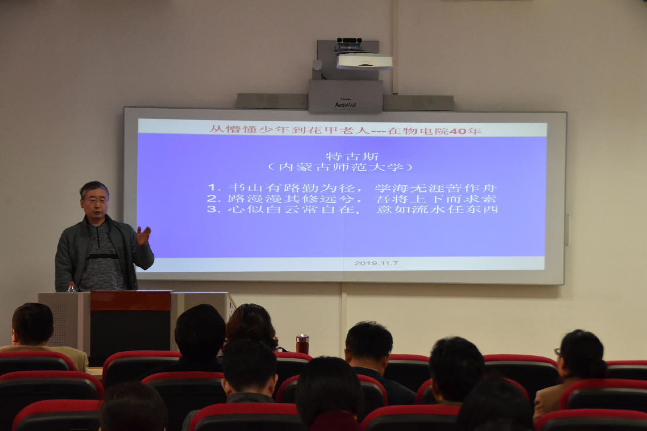11月7日,我院在理工楼B座202召开“不忘初心、牢记使命”主题教育“身边人讲身边事”活动,自治区功能材料物理与化学重点实验室主任、我院特古斯教授担任本次主讲人,以“从懵懂少年到花甲老人—在物电院40年”为题,讲述了一个草原孩子走向世界的故事、一个师大人成功的故事。活动由学院党总支书记刘美玲主持,我院全体教职工参加。