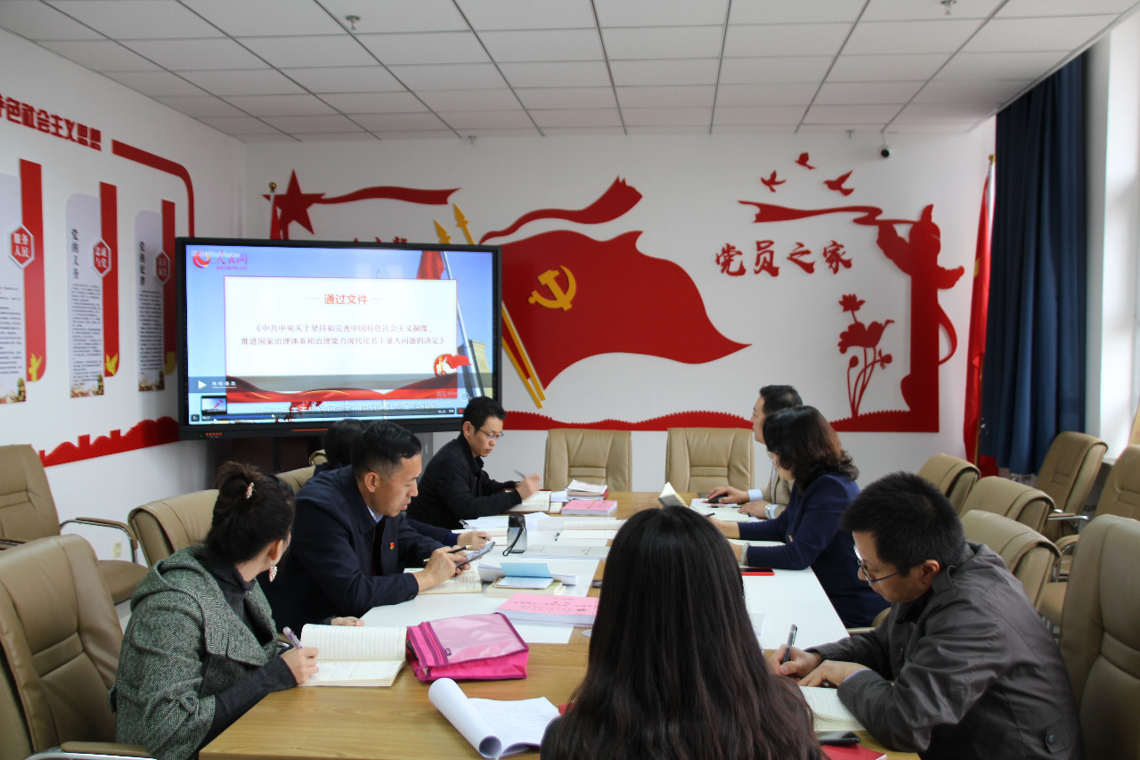 会上学习了中国共产党第十九届中央委员会第四次全体会议公报,对中国特色社会主义制度的科学性、《中共中央关于坚持和完善中国特色社会主义制度、推进国家治理体系和治理能力现代化若干重大问题的决定》的主要内容、如何将制度优势转化为治理效能等方面进行了深入学习。