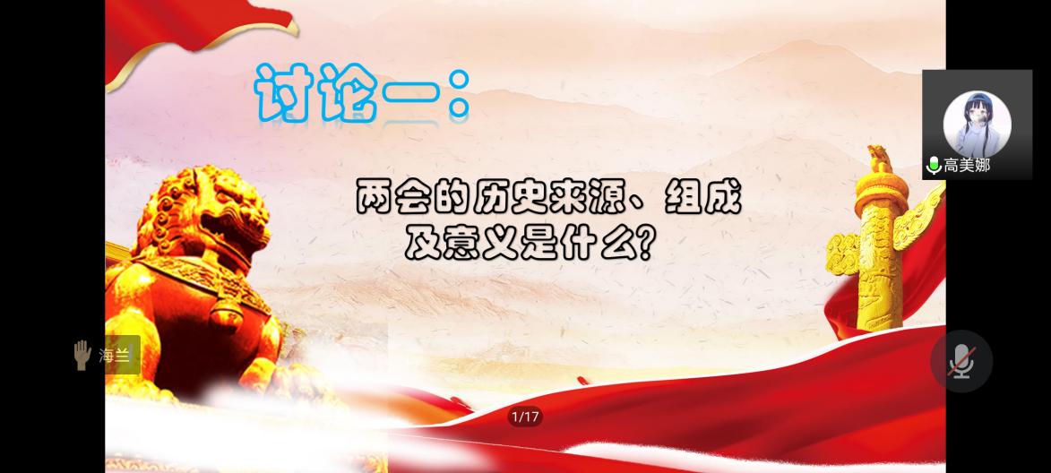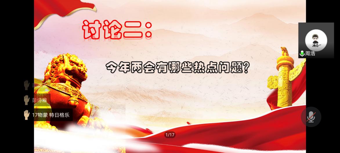 两次小组讨论会是本次培训活动中的一大亮点。同学们积极参与、踊跃发言,讨论会气氛热烈,打破了线下培训空间限制的僵局。大家互相交流,产生了思想碰撞,对两会和人类命运共同体有了更新地理解和认识。