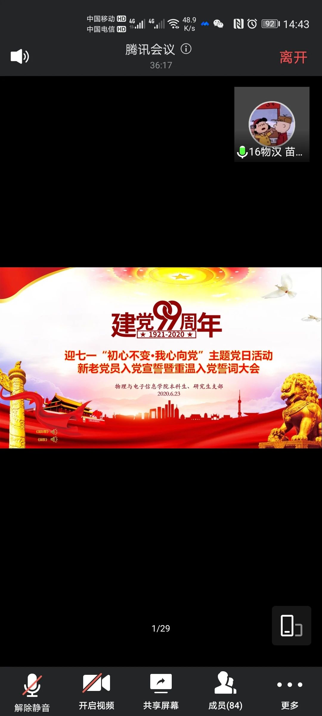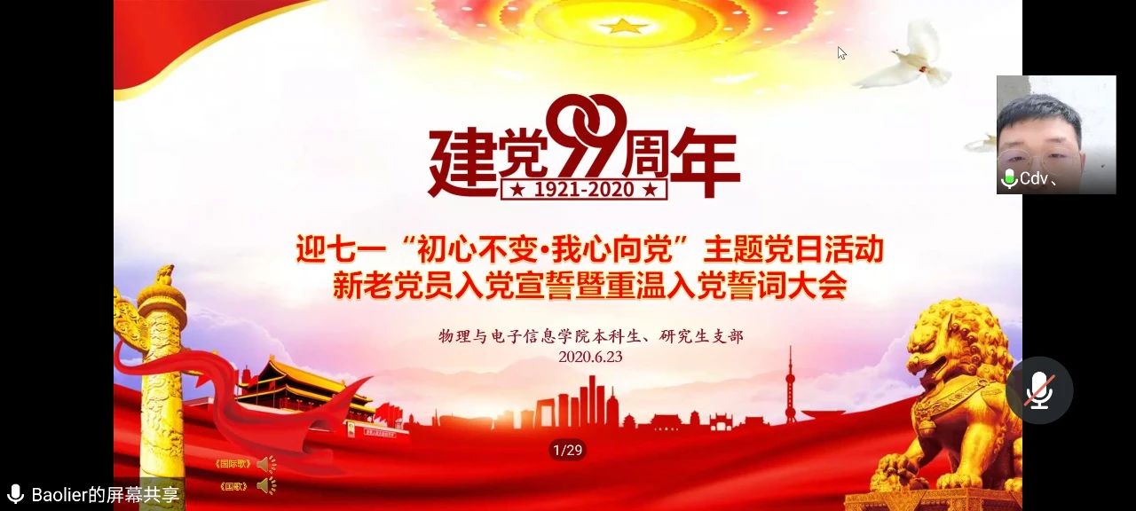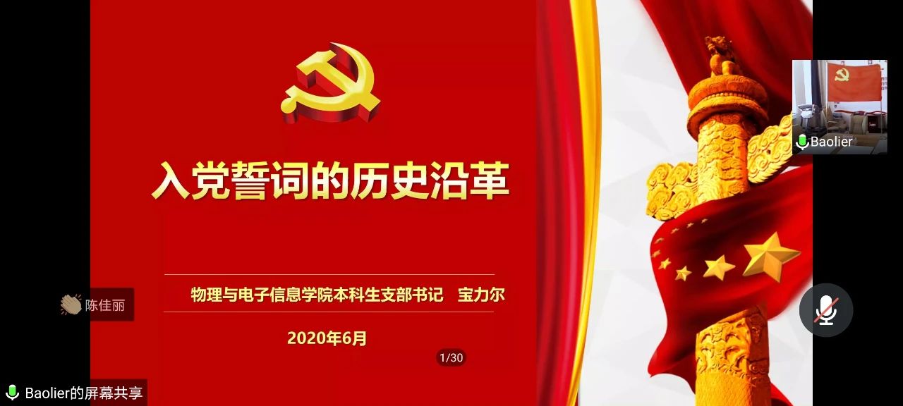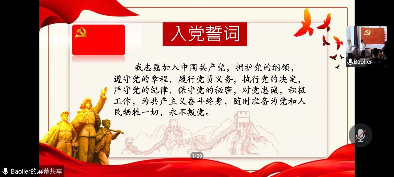 为热烈庆祝中国共产党成立99周年,回顾党的光辉历程,发扬党的优良传统,深入学习贯彻习近平新时代中国特色社会主义思想,进一步巩固和深化“不忘初心、牢记使命”主题教育成果,6月23日下午,yl6776永利集团本科生党支部和研究生党支部联合召开了迎七一“初心不变·我心向党”主题党日活动——新老党员入党宣誓暨重温入党誓词线上大会。学院党委书记刘美玲,党委副书记兼副院长张伟,副院长那日苏,学院党委委员、实验中心主任兼办公室主任张天臣,学就办副主任王乐,团总支负责人、本科生支部书记宝力尔,研究生支部书记木其尔、辅导员宋鑫伟、包文泉老师,以及本科生、研究生支部的预备党员、正式党员共90余人参加了此次会议。会议分两部分进行,第一部分:新老党员入党宣誓暨重温入党誓词,第二部分:本科生支部书记宝力尔讲党课《入党誓词的沿革》。