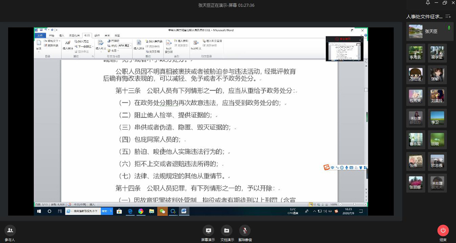 7月9日下午,学院党委书记刘美玲主持理论学习二级中心组(扩大)集中学习会,集中学习《中华人民共和国公职人员政务处分法》(以下简称《政务处分法》)。学院党政领导、环节干部利用企业微信线上开展了学习。《政务处分法》自2020年7月1日起施行,明确规定了政务处分的原则、处分事由、权限和程序等。该法的出台有利于强化对公职人员的管理监督,促进公职人员依法履职、秉公用权、廉洁从政从业、坚守道德操守。