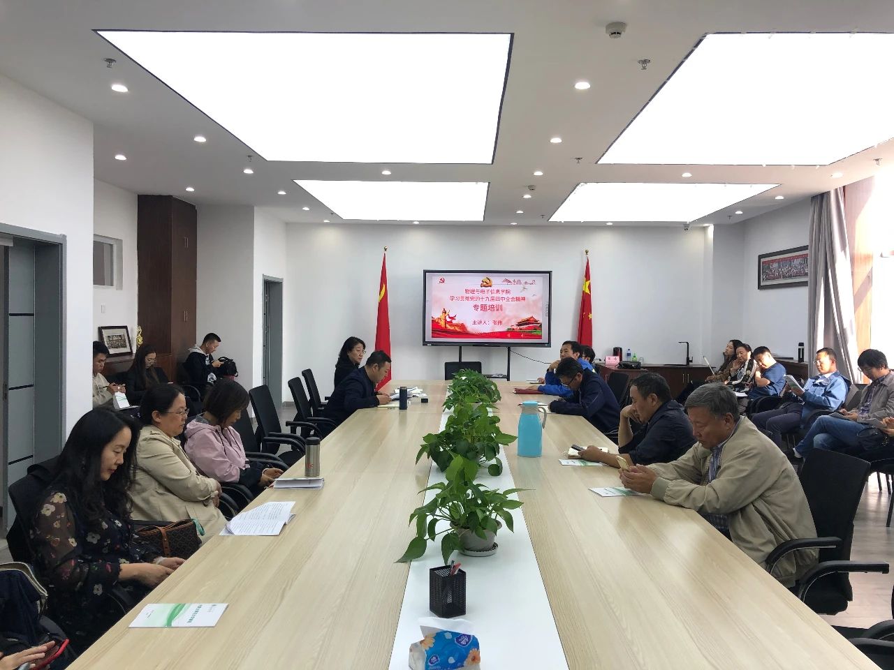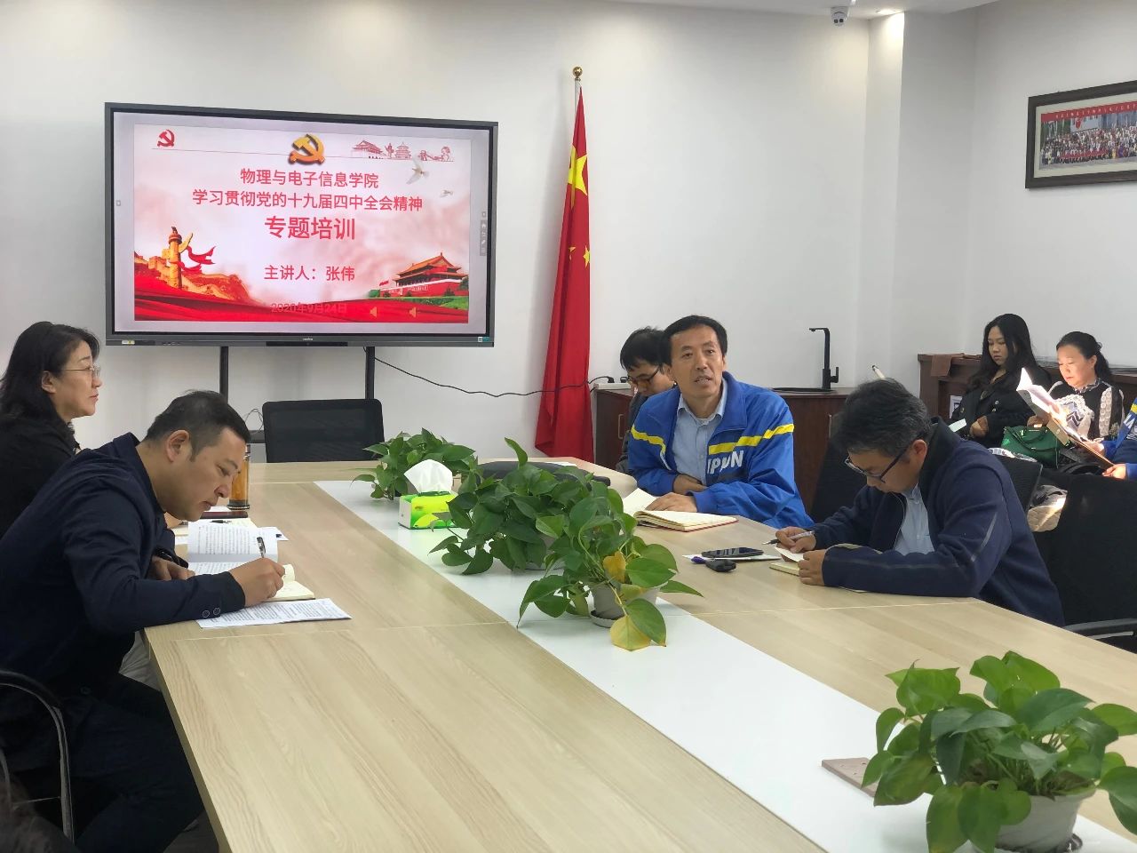 9月24日下午,我院于理工楼A701会议室召开学习贯彻党的十九届四中全会精神专题培训会议。我院党委书记刘美玲、副院长曹永军、副书记兼副院长张伟、副院长那日苏及全体教职工老师参加。会议由党委书记刘美玲主持,张伟副书记为本次主讲人。