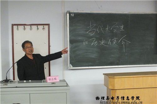 2014年10月11日晚,我院邀请到我校老干部宣讲团郝志模教授为大一新生进行“当代大学生历史使命,你能否承担”理想信念主题讲座。 在讲座中,郝教授对当代青年的不同时期的责任做出了详细的解说。他指出,当代青年承担全面建设小康社会和实现“两个一百年”其中的第一个“一百年”奋斗目标,它是我们当代青年的近期任务;坚定不移的走中国特色社会主义道路,实现中华民族的伟大复兴,完成第二个百年奋斗目标,维护世界和平,这是我们当代青年的长期任务。他最后勉励在座的大一新生们,青年是祖国的未来,民族的希望,青年兴则国家兴,作为当代青年,一定要有理想,有抱负,望同学们心中有国,敢于担当!随后,在座的同学们发出热烈掌声,讲座在热烈的鼓掌声中结束。