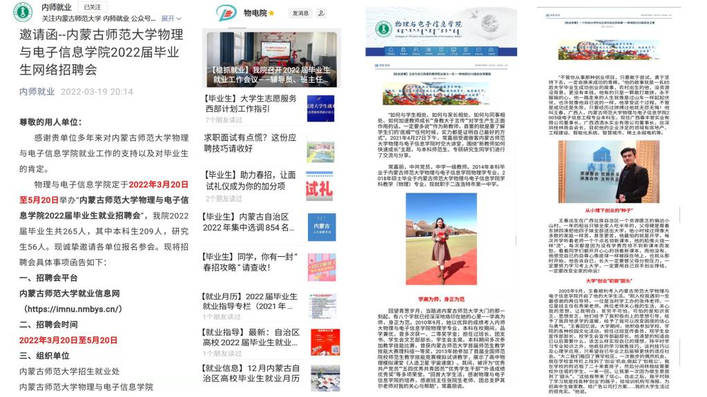 学院充分挖掘物理系、电子系、材料系教师就业资源和校友资源,将就业推荐与专业实习、毕业设计有机结合,扩展社会企业对接渠道,积极开拓市场性岗位。学院教师积极联系了显泓科技、万德、起立科技、科电数据、上海霆华能源、内蒙古欧晶科技股份有限公司等用人单位,从3月份开始陆续为学生提供线上面试机会。历届毕业生校友也积极推送所在单位的招聘信息。为了搭建毕业生求职和用人单位招聘的对接通道,我院于2022年3月20日至5月20日举办“yl6776永利集团2022届毕业生专场网络招聘会”,努力实现云中招聘不断线,云中服务不断档,就业指导不停歇。