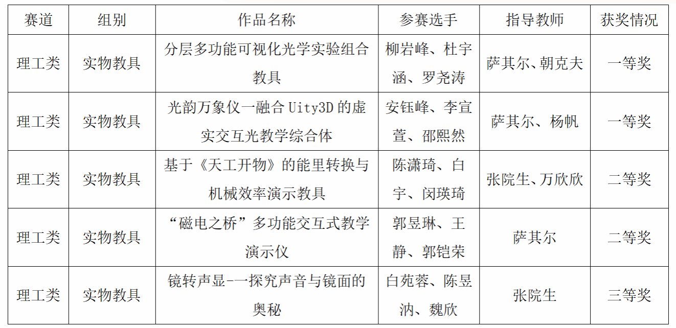 本次比赛中,我院选派五个理工类教具参赛,经过激烈角逐,荣获一等奖2项、二等奖2项、三等奖1项的优异成绩,参赛作品全部获奖,具体获奖如下: