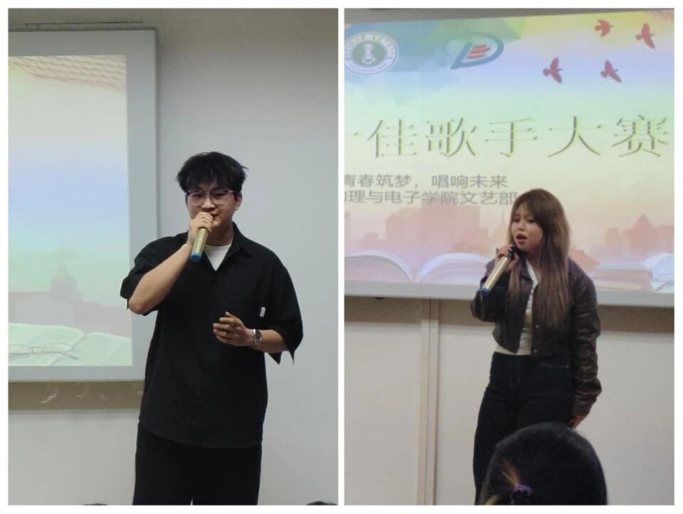 参赛选手依次登台演唱,用歌声传递热爱与青春活力。现场气氛热烈,掌声与喝彩声此起彼伏。经过角逐,2024级物理学四班白萨如拉、2025级物理学二班刘轩宇两位同学脱颖而出,将代表学院参加校级比赛。期待他们在校赛中的精彩表现。