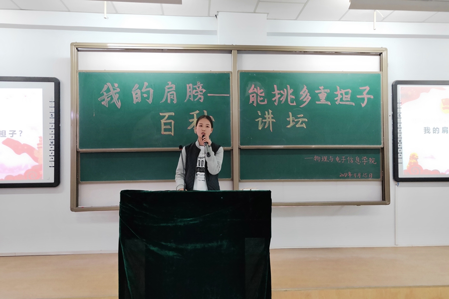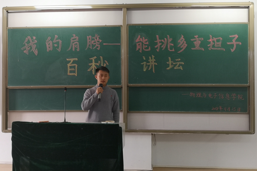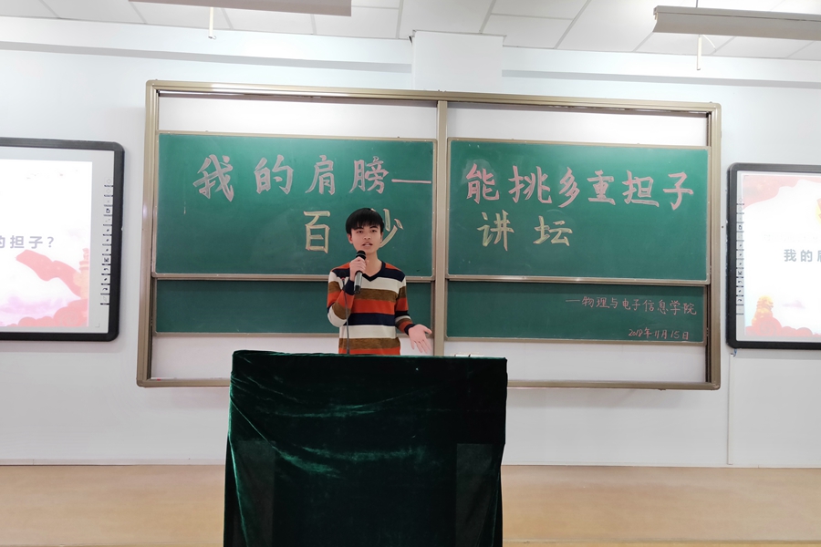 2018年11月15日,我院于行知楼105教室举办“我的肩膀--能挑多重担子”百秒讲坛演讲比赛。18级电子信息工程班、电子信息科学与技术班班主任段国俊、辅导员芦嘉琛、宋鑫伟、王乐以及和主席团成员受邀出席并担任本次活动的评委,2018级全体学生观看了本次比赛。