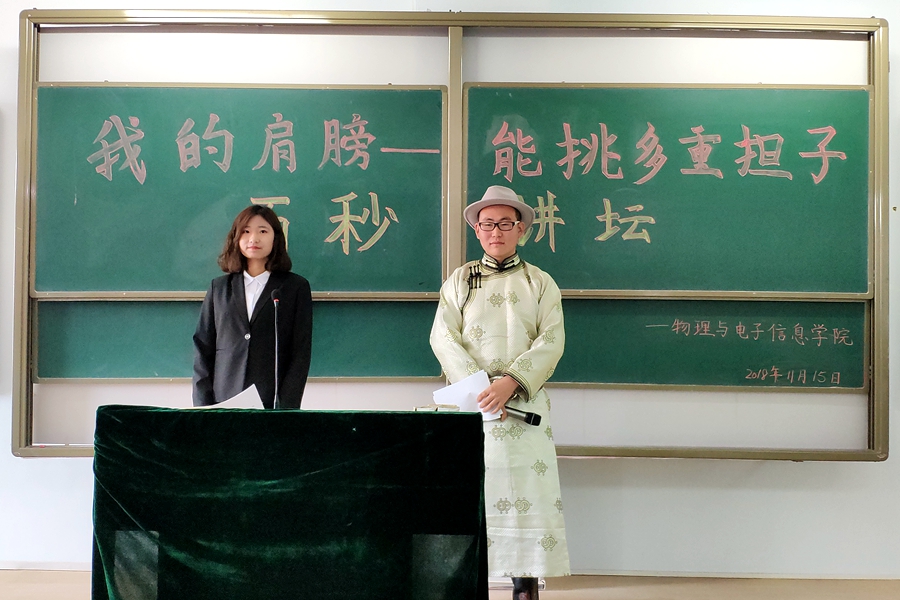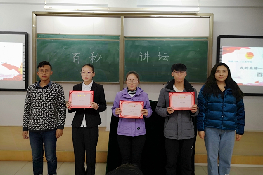 伴着优美动听的音乐,主持人宣布此次比赛正式开始。比赛中,35名选手依次登台演讲。他们言辞流利,妙语连珠,虽然只有短短百秒,却以最饱满、最真挚的情感,表现出争做担当民族复兴大任时代新人的使命感和责任感。选手们精彩的演讲赢得了观众们的喝彩,也得到了评委们的鼓励与认可。最终,18级物理学蒙班黄雪萍同学荣获一等奖,18级电子信息工程班温李泽宇、物理学汉班田旭同学获得二等奖,17级电子信息工程二班徐玥辉、物理学蒙班海日汗、18级电子信息工程班海兰同学获得三等奖。