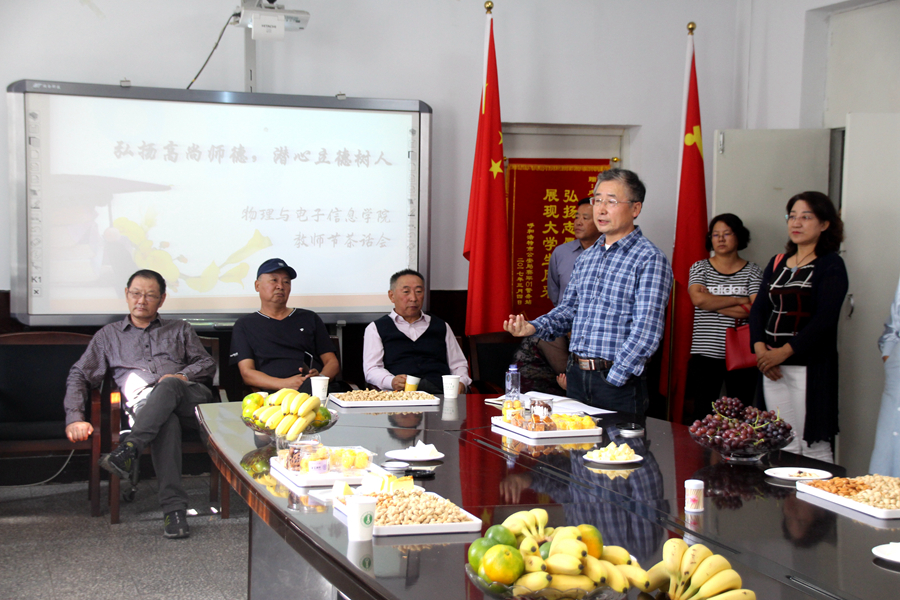 2018年9月7日,我院于物理楼会议室举办以“弘扬高尚师德,潜心立德树人”教师节主题茶话会。学院院长特古斯教授、副院长吉日嘎拉教授、副院长刘美玲老师、退休老教师及全体教师参加茶话会,会议由特古斯教授主持。