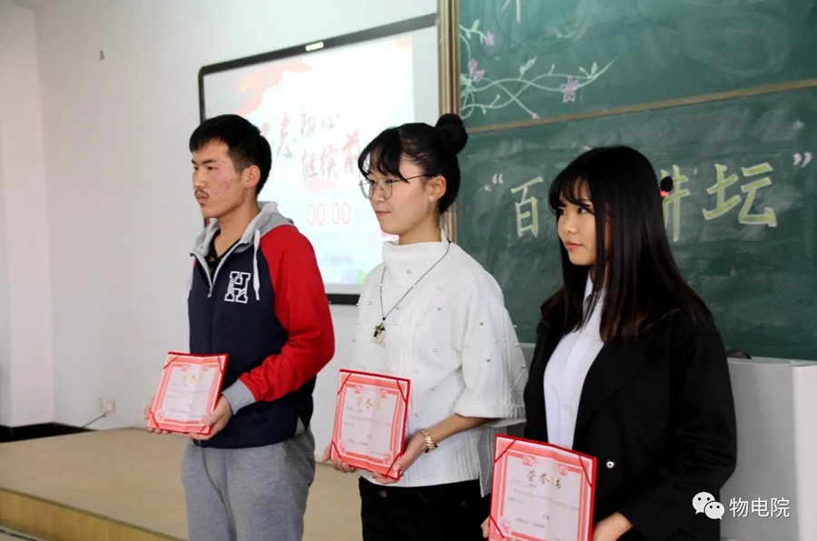 本网讯 2017年11月12日下午两点,由我院举办的“不忘初心,继续前进”主题演讲比赛在行知楼323顺利举行。担任本次活动的评委有学工办木其尔老师及学生会主席团成员。来自2017级二百多名学生观看了此次演讲比赛,比赛在同学们的热烈掌声中拉开帷幕。 十五位选手准备充分,他们身着正装、精神饱满、声情并茂,用饱含深情的语调抒发了对国家的挚爱与赞美之情,准确地把握十九大的基本精神,纵观全局,表达了对祖国美好未来的无限憧憬。演讲结束之后,木其尔老师对各位选手的表现做出客观点评,选手们受益匪浅。 比赛最后评定出了八位获奖选手,其中赵兴禹获得冠军,钱莫闲、周鑫获得亚军,达日恒,马妍,张志娟三位同学获得季军。随后,木老师为获奖同学进行颁奖并合影留念。 本次比赛旨在调动同学们的积极性,锻炼大一同学的演讲能力,强化同学们的爱国意识。同时也增强了当代大学生的社会责任感,树立起共建和谐文明校园的新观念。
