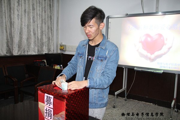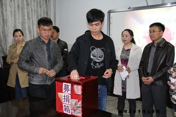 2016年4月12日下午四点半,募捐活动在我院会议室准时举行,我院党总支副书记何小龙老师,办公室主任斯琴高娃老师,团总支书记萨其尔老师以及学工办苏雅拉老师和王星老师出席募捐活动。何老师在募捐现场再次向各班级负责人说明了陈老师的病情状况和治疗进度,并多次替陈老师对献出爱心的同学们表达感激之情。同学们献出的不仅仅是一份爱心,更是一份沉甸甸的希望。