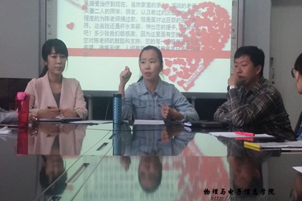 本网讯 我院青年教师陈玉和,于2015年12月27日,在北京协和医院被确诊为多发性骨髓瘤,治疗费用金额巨大。为助陈玉和老师渡过难关,我院于2016年4月7日中午,在物理楼会议室召开为陈玉和老师募捐动员会议,其中各班级班长和生活委员参加本次会议,并由我院团总支书记萨其尔老师主持会议,在会议上萨老师向同学们说明了陈玉和老师的病情,以及此时面临的困境,同时向同学们介绍了陈老师生病前在学院日常工作中的优秀表现和对同学们的认真负责。一句“我什么时候才能回去讲台,再给我的学生们上一节课。”湿润了在场所有人的眼眶。会议旨于动员全院学生伸出援手,为陈玉和老师献出自己的一份爱心,尽一点绵薄之力。暂定于4月12日组织各班级为陈玉和老师募捐活动。