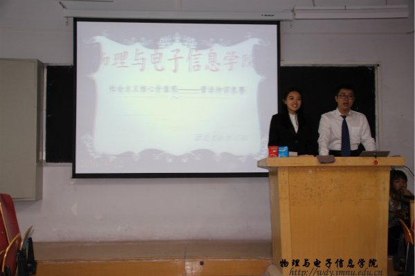 本网讯 2016年4月12日晚,我院在田楼210教室举办践行社会主义核心价值观系列活动----普法知识竞赛。大一各班分别派出代表队参加本次竞赛。比赛过程中,参赛选手反应迅速,积极回答,密切配合,将比赛一次次推向高潮,展现出学院良好的精神风貌。最终,我院15物理汉班黄威海同学荣获第一名。通过这次比赛,既加强了我院同学在比赛上的应对能力,也发扬他们认真负责,努力进取的精神,更重要的是让同学们对社会主义核心价值观有了更加深刻的认识和了解。