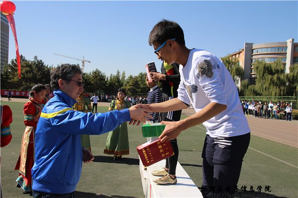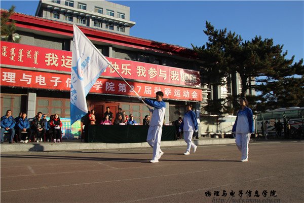 本网讯 2015年10月18日上午,在我校的东操场,伴随着庄严的国歌与嘹亮的入场口号,我院的第27届秋季运动会拉开帷幕。我院院长特古斯教授,党总支副书记何小龙老师,副院长吉日嘎拉教授,团总支书记萨其尔老师等多位领导、老师及各班班主任共同出席此次院运会。入场式上,国旗队、彩旗队、花束队、裁判代表方阵、各班的方阵排成整齐的队列,迈着雄健有力的步伐走过主席台。在运动员代表、裁判员代表庄严宣誓后,特古斯院长致开幕词,并由何小龙老师宣布本届运动会正式开幕。随着运动会开幕式的结束 ,吉日嘎拉教授打响了本届院运会的第一枪,运动会各项赛事开始有序进行。