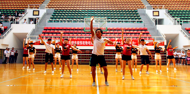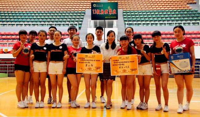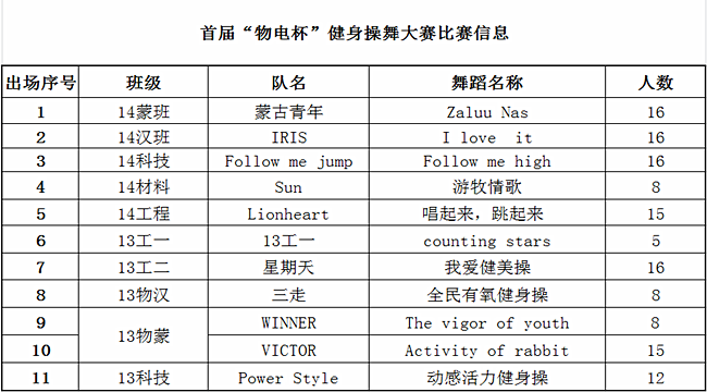 首先,副书记何小龙老师致大赛开幕词,他指出:健身操舞作为综合的大众艺术,是融体操、音乐、舞蹈于一体的追求人体健康与美的运动项目,通过将其与我院正在深入推进的“三走”活动有机结合,使我院广大学生达到改善体质、塑造体型、愉悦精神、陶冶情操等目的,更好的服务于日常学习生活。随后,院长特古斯教授宣布比赛表演正式开始;来自大一、大二年级的十一支代表队按照抽签依次进行了比赛表演,每支比赛队伍青春洋溢,激情澎湃,在动感节拍下舞动青春旋律,在欢声鼓舞中跳起的自信脚步;最终,经过评委现场打分汇总,14级工程班荣获冠军并捧起“物电杯”,13级物蒙班和13级工二班分获二、三名,经微信投票确定13级物蒙班荣获最佳人气奖;主持人宣布以上获奖名单,领导评委并亲切与各参赛队伍合影留念。在颁奖环节,同时颁发了“我宿我们行”宿舍文化月活动、“麦克斯韦的光圈”第二届摄影大赛获奖个人和集体奖项。