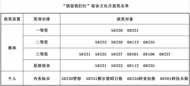 “我宿我们行”宿舍文化月成果简介:该活动历时一个多月,各宿舍积极加入装饰宿舍的队伍之中;经过同学们的努力,宿舍变得焕然一新;在活动结尾,经过汇总之前的内务情况,并且邀请了我院部分领导老师参观和评选了同学们装饰完成的宿舍。根据各宿舍在文化月期间的内务优良和装饰主题新颖积极,在宿舍文化月活动三个环节的总分为标准评选出了:以各宿舍的装饰主题得分评出个性宿舍8个(其中一等奖2个,二等奖2个,三等奖4个)。根据被推荐同学的日常内务以及文化月期间的表现为标准评选出了内务标兵8名,并为宿舍文化月活动中获奖的宿舍和个人颁发奖品和奖状。