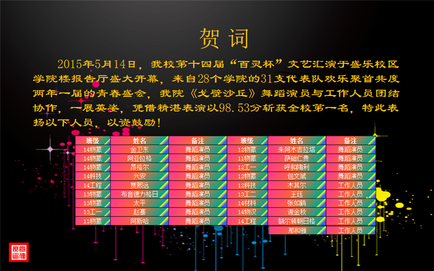 “百灵杯”舞蹈《戈壁沙丘》演职人员表扬名单