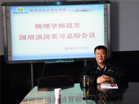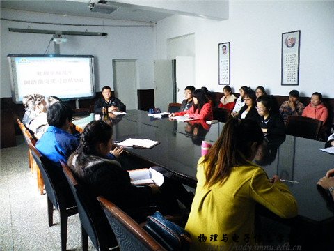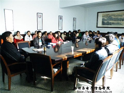 2014年3月10日下午三点,我院领导在物理楼会议室举行了有关“国培计划”的总结会议,参加此次会议的有副院长吉日嘎拉教授、10级汉班班主任张院生老师、10级蒙班班主任朝克夫老师、11级汉班班主任萨其尔老师、10级汉班全体同学、10级蒙班部分同学及11级汉班部分同学。