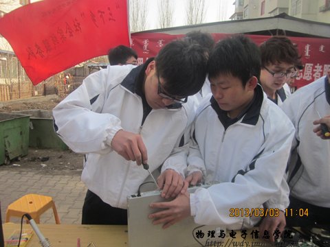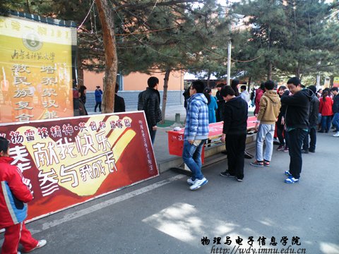 在活动期间,3月3日,我院科技协会深入师大家属院,开展了义务维修活动,受到了社区居民的热烈欢迎,对参加维修活动同学的水平也赞叹有加。第二日,我院在校园内外开展了义务清洁活动。帮助交警打扫警卫厅周围的环境,为减轻交警的工作压力提供很大的帮助。在雷锋活动日当天,我院在餐厅门前举办“学习雷锋,动员签字”活动。将雷锋精神落实到每位师生的学习、工作和生活中,有效建立学雷锋的长效机制,为营造文明和谐的校园贡献自己的一份力量。