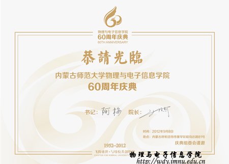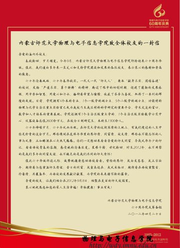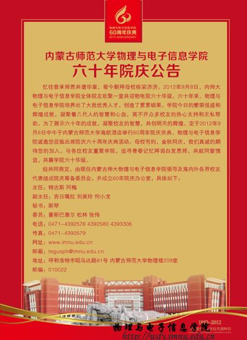 六十载耕耘不辍,六十年春华秋实。2012年,永利官网将迎来六十华诞,yl6776永利集团(原物理系)也将迎来六十周年院庆。六十年来,yl6776永利集团培养出了大批优秀人才,创造了累累硕果。学院今日的繁荣强盛和辉煌成就,凝聚着几代人的智慧和心血,离不开社会各界和众多校友的热心支持和无私帮助,为了展示六十年的成就,凝聚校友的智慧,共创明天的辉煌,yl6776永利集团定于2012年9月8日中午于永利官网海航酒店举行60周年院庆庆典,学院全体师生诚邀您莅临出席院庆六十周年庆典。母校有约,金秋同庆,我们真诚的期待您的加入,与各位校友重聚学院,追寻青春记忆拜谒白发恩师,共叙同窗情谊,共襄学院六十华诞。