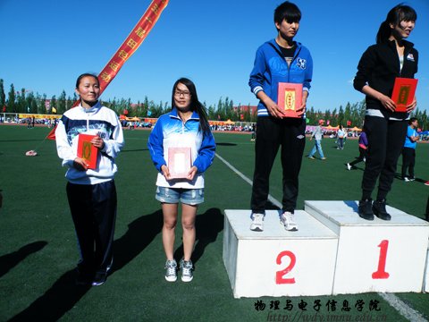 在今天的比赛中我院健儿精彩继续呈现:丁泽民获得男子甲组400米第五名、德力格尔获得男子甲组400米第八名、昂格力玛获得女子甲组800米第八名、丁泽民获得男子甲组400米栏第五名、顾啸天获得男子甲组400米栏第七名、哈布日获得女子甲组400米栏第四名、白春艳获得女子甲组400米栏第八名、小兄获得女子甲组铁饼第七名、萨日娜获得女子甲组跳高第四名、刘婷婷获得女子甲组跳高第五名、女子甲组4*100米接力获得第七名。