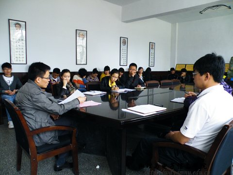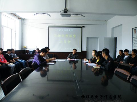 2012年4月9日中午12:30,我院领导在物电院一楼会议室召开了第五十届学校运动会动员会,全院上下高度重视此次校运会,加大资金投入,由学院学工组全体老师负责开展训练参赛事宜。参加此次动员大会的领导有学院党总支副书记何小龙老师,学工办王伟老师、团总支萨其尔老师以及入选院队的所有运动员。