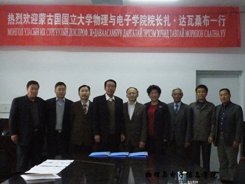 根据2011年9月6日杨一江校长与蒙古国国立大学校长特木尔敖其日代表两校签署的合作协议,10月13日蒙古国国立大学物理与电子学院院长来我院在科学研究、学术交流、人才培养等方面的合作进行了协商。