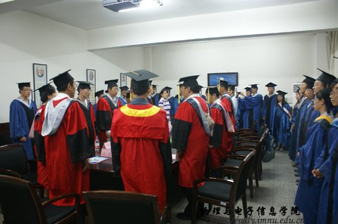 7月5日下午16:00我院在物理楼会议室隆重举行了2011届硕士研究生毕业典礼暨学位证书颁发仪式,参加毕业典礼的有,院长张伟教授,党总支书记阿梅老师,党总支副书记何小龙,副院长吉日嘎拉、副院长刘美玲和学院全体研究生导师及2011届全体硕士毕业研究生。