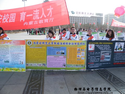 3月18日,由校保卫处代表市教育厅组织的社会治安综合治理宣传在新华广场举行。此次活动的参与者全部为我院09、10级同学。我院设计的展板被选中并展出。活动期间同学通过展板绘声绘色的为市民讲解安全知识,的到广大市民的好评,纷纷夸赞当今大学生的素质高、知识丰富。