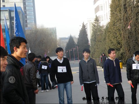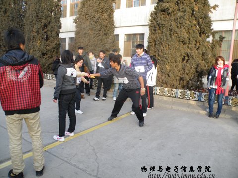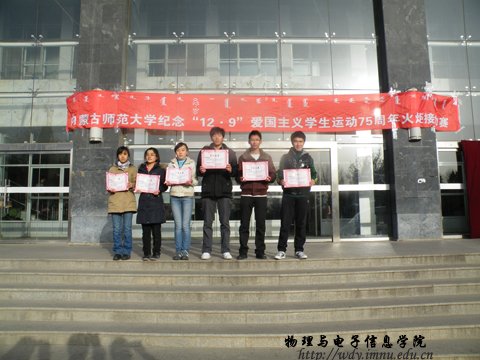 12月9日即“一二·九”学生爱国运动七十五周年之际,我院积极配合校学生会参加了于图书馆前举行的校园火炬接力赛。首先进行的是由五男五女组成的十人竞赛组,并且取得了团体总分第三的好成绩。随后参加了由三男三女组成的学生会趣味组。
