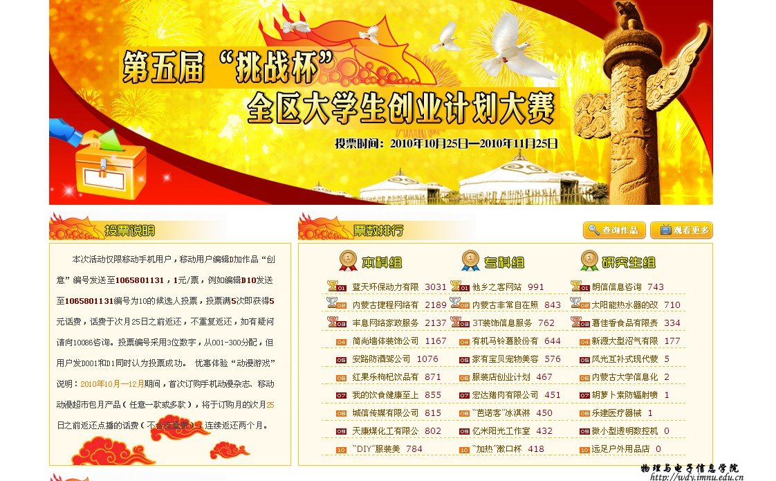 请移动用户编辑D262发送至1065801131为我院学生投票。投满5次即可获得5元话费(仅限移动用户1元/条,次月25日前返还)。投票时间为:10月25日至11月25日。