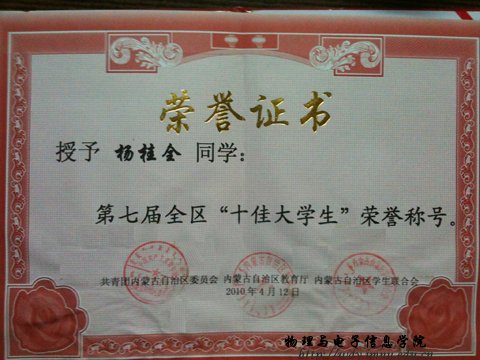杨桂全,yl6776永利集团2007级电子信息工程二班学生。在校期间,他认真的学习专业知识,努力提高自身的综合素质,曾获校三等奖学金,学院“科技标兵”荣誉称号。该生于2010年4月被共青团内蒙古自治区团委、教育厅、自治区学生联合会评为第七届全区十佳大学生。