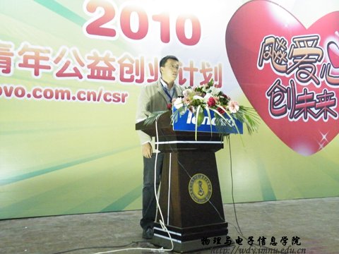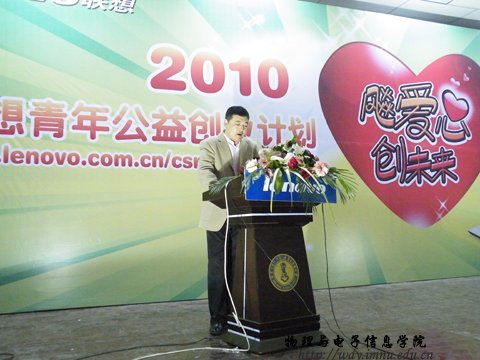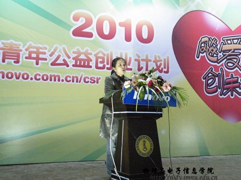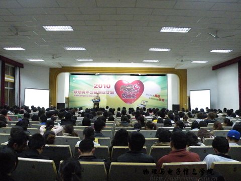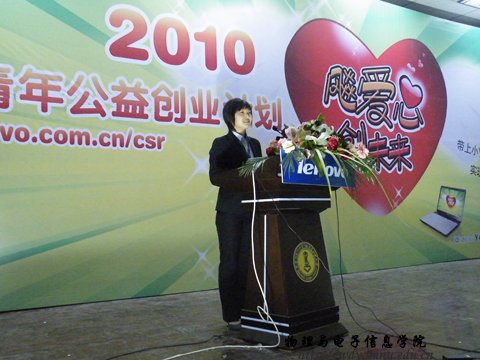 2010年4月24日晚上7:00中,联想公司在我校生物报告厅举行“飚爱心,创未来”公益创业活动讲座。我院学生积极主动参加此次公益创业活动。活动现场同学们踊跃参与互动环节,并且积极提出问题。台上人员尽心解答,使整个现场气氛活跃。