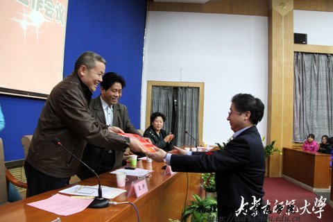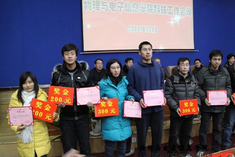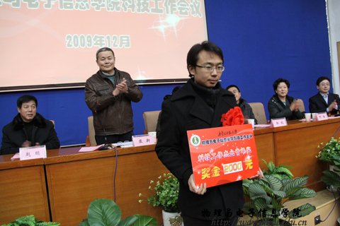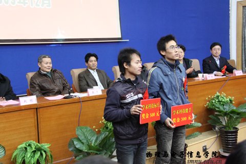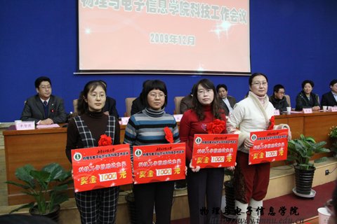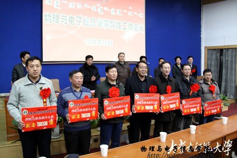 随后,学院党总支书记阿梅宣读了学院“十一五”期间科技工作先进个人和学生学术科技活动先进个人及学院第二届学生课外学术科技活动优秀作品、优秀指导教师的表彰决定。对近四年涌现出的先进集体及个人进行了表彰奖励。授予特古斯教授突出贡献奖,奖励5000元;授予郭子政等10名教师科技工作先进个人奖,奖励2000元;授予那日苏博士科技工作杰出青年奖,奖励2000元;授予萨茹拉等4名教师科技工作鼓励进步奖,奖励1000元。授予杨桂全同学“学术科技标兵”称号,奖励500元;授予蓝荣同学“学术科技能手”称号,奖励300元;同时,表彰在我院第二届学生课外学术科技作品竞赛中荣获一等奖的何玮等3名同学,发奖金300元;荣获二等奖的包文君等7名同学,发奖金200元;荣获三等奖的王瑞民等10名同学,发奖金100元;授予梁学军等6人为优秀指导教师,授予07工程2班、09科技班优秀组织奖。与会领导为获奖师生颁发了奖金和荣誉证书,获奖教师代表郭子政教授在大会上作了发言。