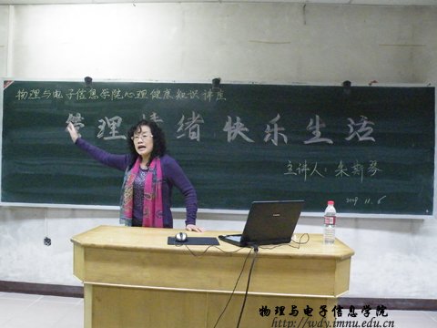 在心理健康活动月期间,11月6号晚上7:00在信息楼第三公共教室,一场别开生面的大学生心理健康知识讲座拉开了序幕。我院同学聆听了内蒙古大学心理咨询中心朱斯琴老师精心准备的心理健康知识教育讲座。朱老师以生动的图片和道理来指导我们如何过好大学生活。