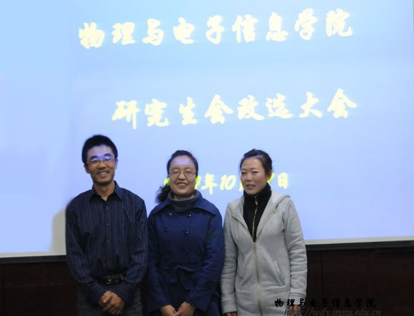 10月27日下午,由学院特古斯副院长主持召开了全体研究生大会。经全体研究生投票选举产生了学院新一届研究生会成员。结果公布如下:主席: 李利宾(07级)(左一);副主席:冬梅(08级)(中), 林彬(09级)(右一)