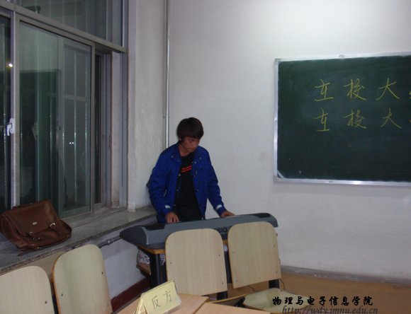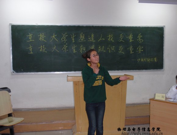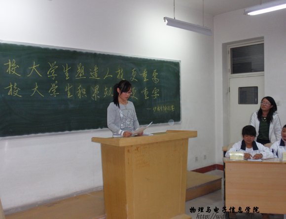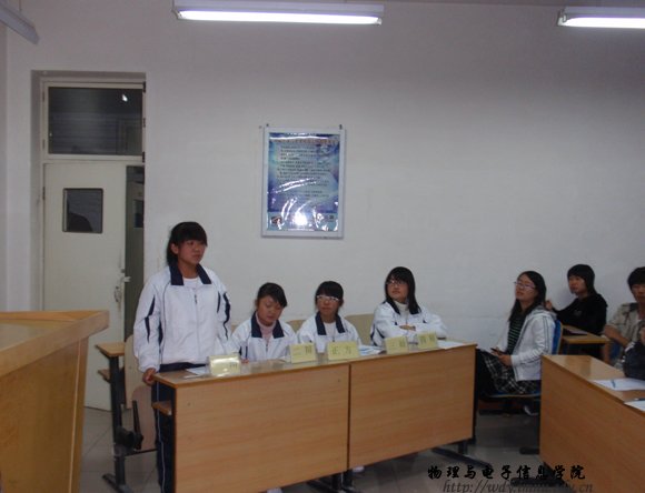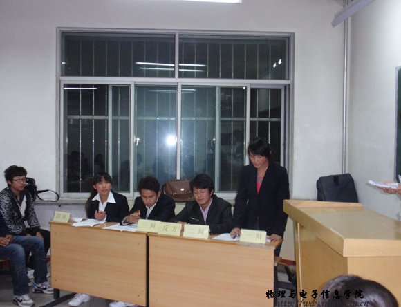 10月15日晚7:30,在田楼128进行了第一场比赛,正方为09工程1班,题目为在校大学生塑造人格更重要,反方为09物理蒙班,题目为在校大学生积累知识更重要。比赛当中各位辩手积极发言,气氛高涨。赛后,一些同学表演了优美的文艺节目,把辩论赛推向高潮。使辩论赛有了一个好的开头。最后,09工程1班获胜。明天将进行09工程2班和09物理汉班的比赛,敬请关注。