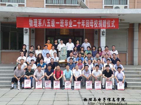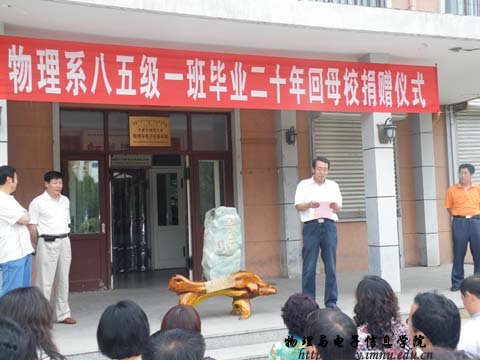 物理系八五级一班毕业二十年回母校捐赠仪式于7月19日上午10点在物理楼前举行,全体同学祝母校宏基伟业、千秋恒泰;祝学院教学科研硕果累累;祝老师身体健康、桃李满天下!