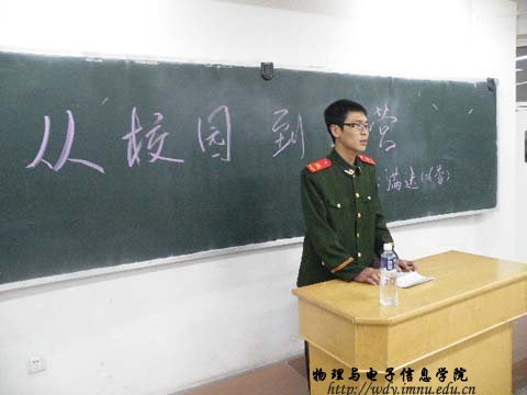 3月17日晚7点半,yl6776永利集团在田八共组织了主题为《从校园到军营》的讲座,08级物理蒙班、科技班、工程2班同学聆听了此次讲座。主讲人满达同学入伍前系我院2004级物理蒙班学生,在大一时走入了绿色的军营,现在他已经退伍,光荣地完成了他的军旅生涯,就读于我院06蒙班。