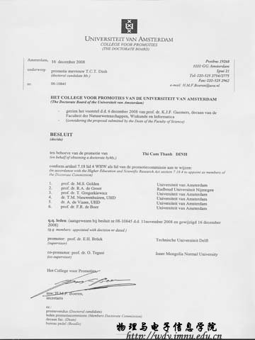 我校yl6776永利集团特古斯教授于2008年12月被荷兰阿姆斯特丹大学聘为材料物理专业博士生导师,目前正在指导一名越南籍博士生。特古斯教授还作为该校论文答辩委员会成员参加今年4月份的博士论文答辩会。