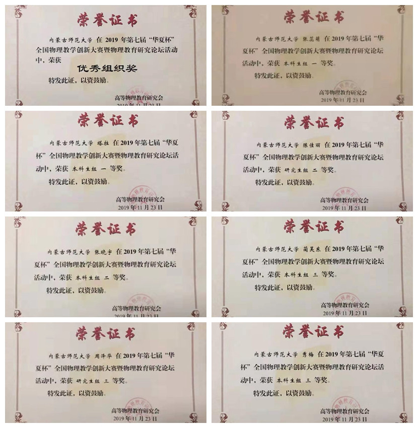 本次比赛分为物理教学创新大赛(研究组、本科组、中学物理教师组),物理教育研究论坛两个赛事。yl6776永利集团2018级学科教学物理专业研究生陈佳丽同学获研究生组教学创新大赛二等奖,2018级学科教学物理专业研究生周泽华、刘玉晨两位同学分获三等奖。2017级本科物理汉班张蕊萌、塔拉两位同学分获教学创新大赛一等奖,2017级物理汉班张晓宇获二等奖,2017级物理汉班蔺昊东、2017级物理蒙班秀梅分获三等奖。我院孟根巴根、孙咏萍和其木格三位老师分获“优秀指导教师奖”,永利官网荣获组委会颁发的“优秀组织奖”。